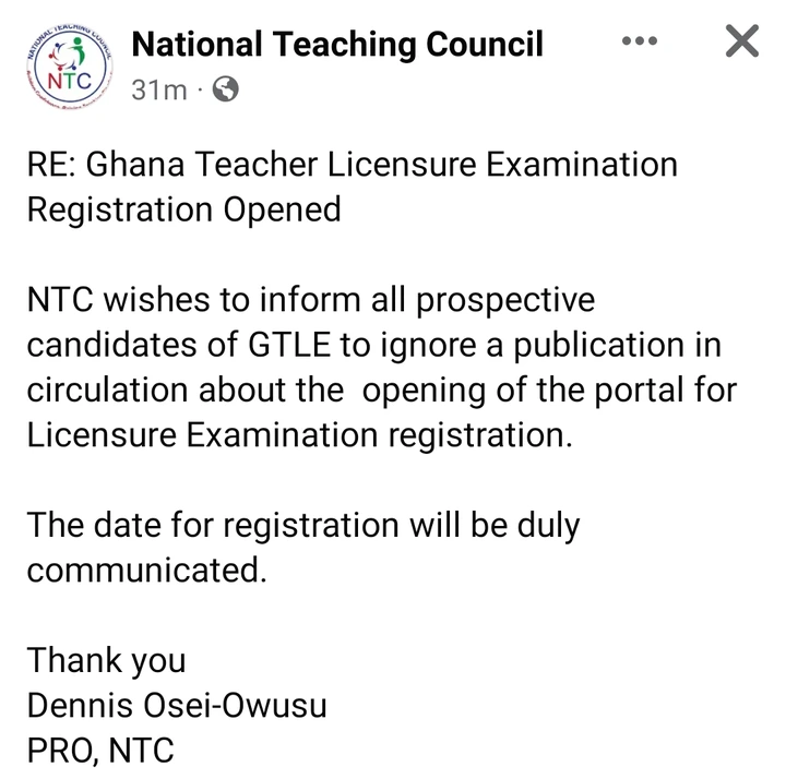 “RE: Ghana Teacher Licensure Examination Registration Opened